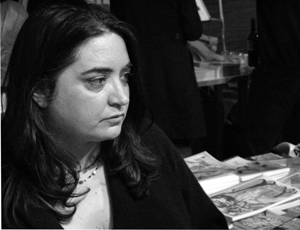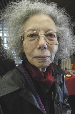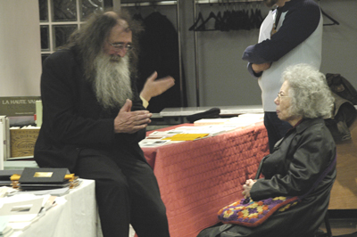 Françoise Hàn , assise derrière le stand du Chasseur abstrait, attentive et profonde.