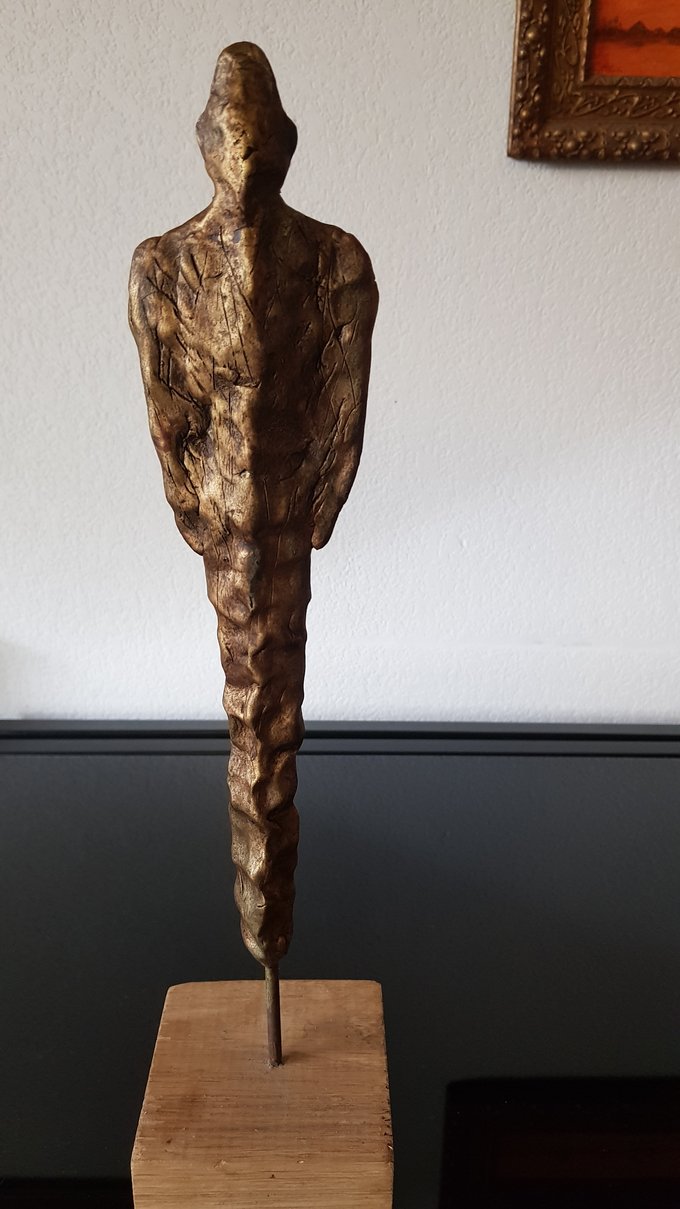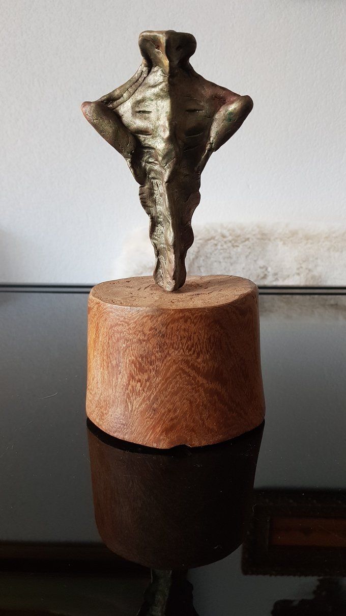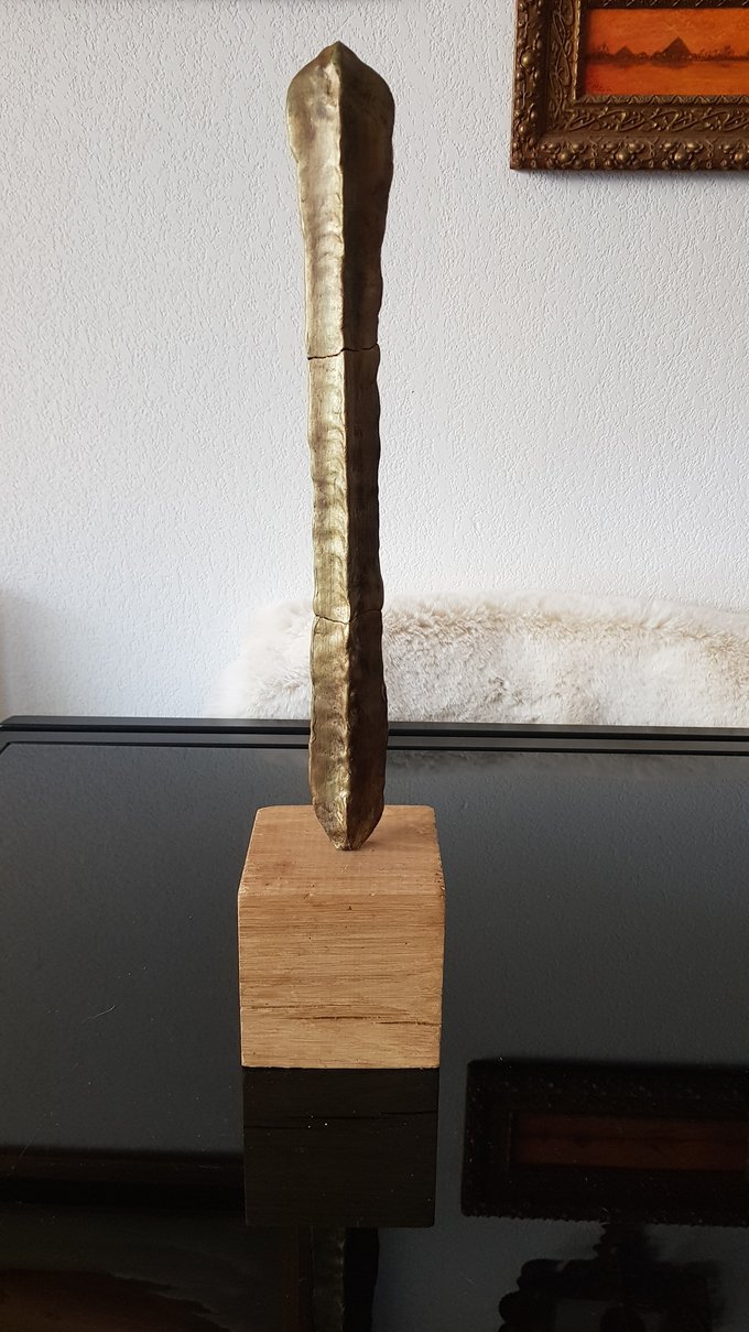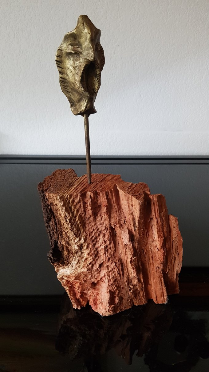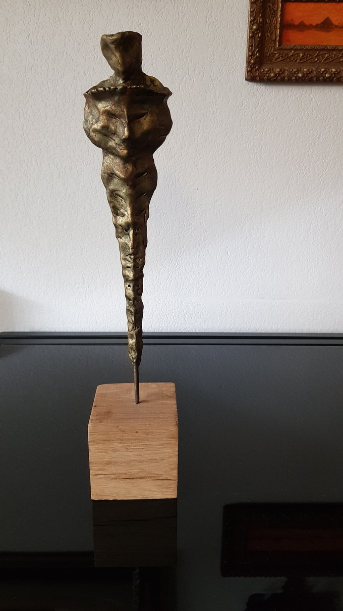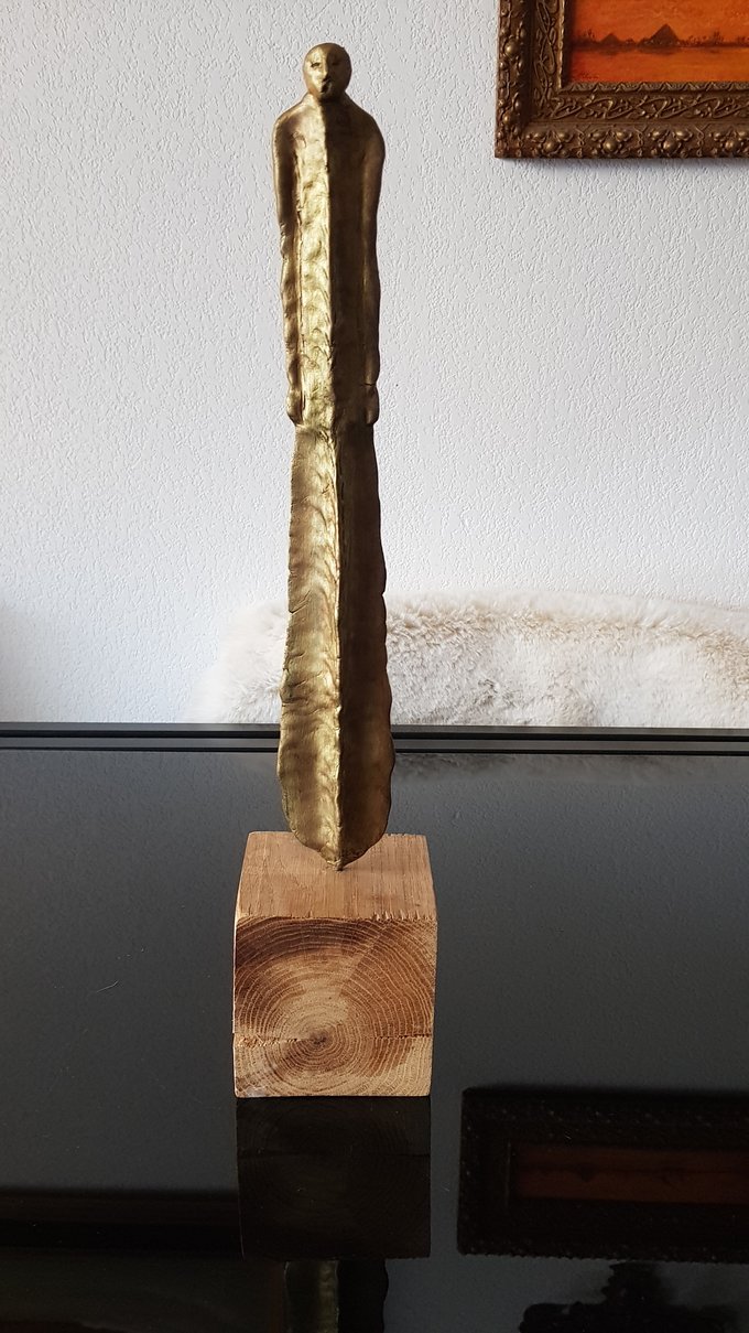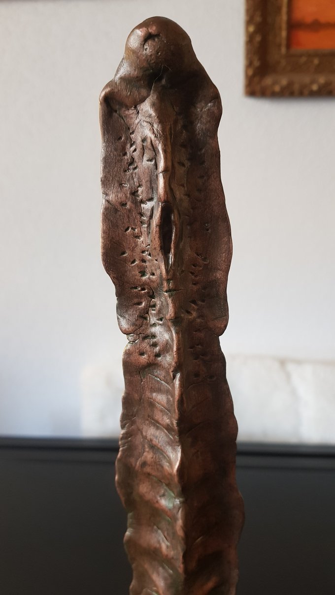 Le socle, ce cube de bois clair fendu de cercles, donne racine. C’est l’histoire du vivant sciée nette. On y voit les années, les douleurs, les saisons. Le bronze, lui, pousse de là, comme une tige ou une colonne. Il semble vouloir rejoindre ce qui nous dépasse. Ces figures sont des arbres inversés, des totems amaigris, des témoins. L’homme s’y retire, mais le geste reste.