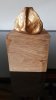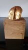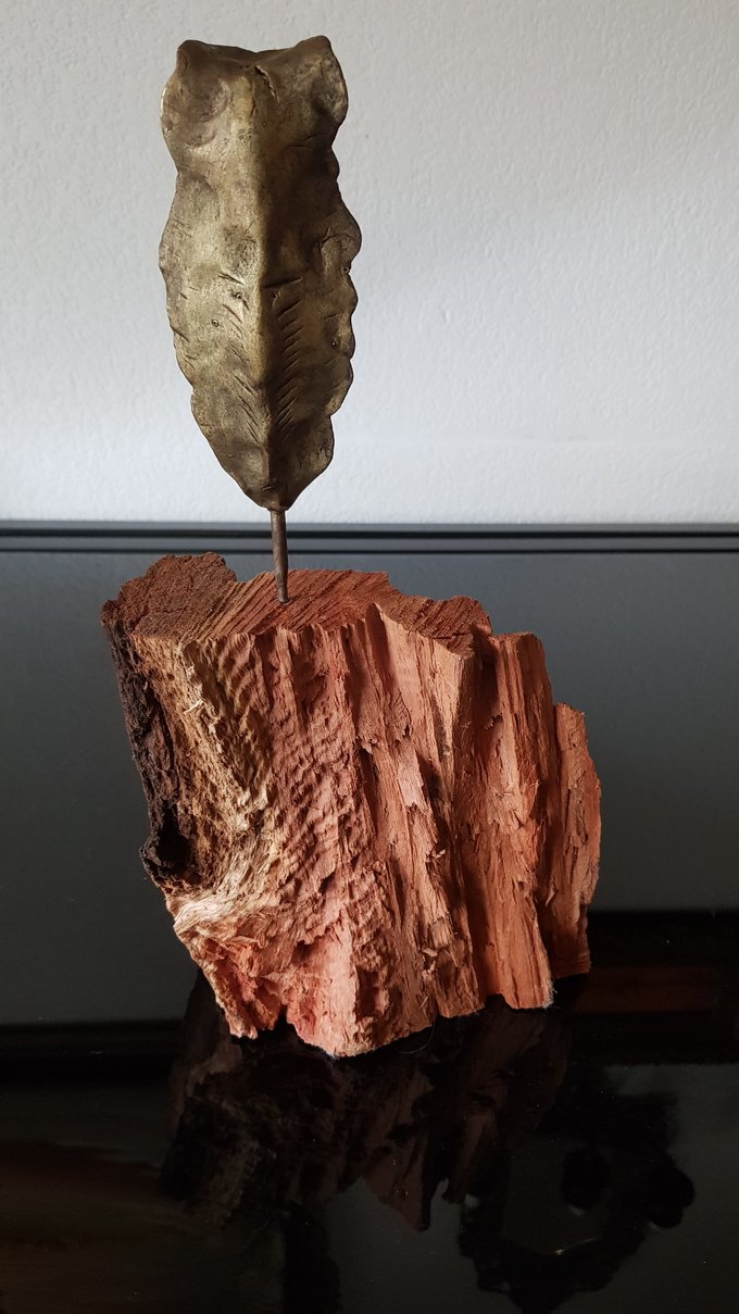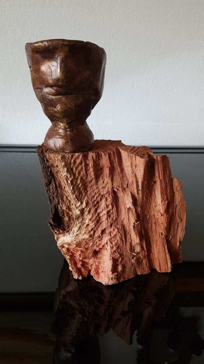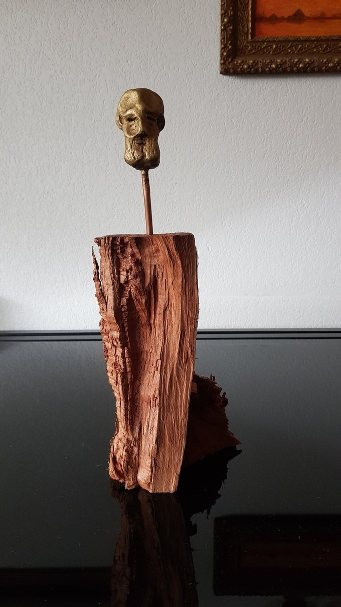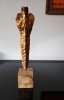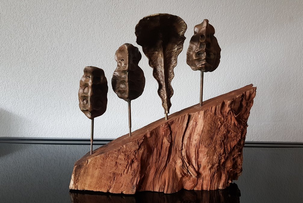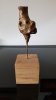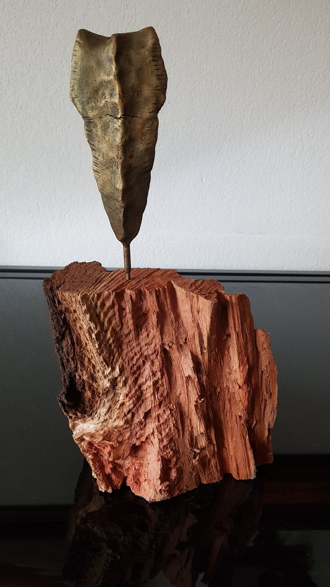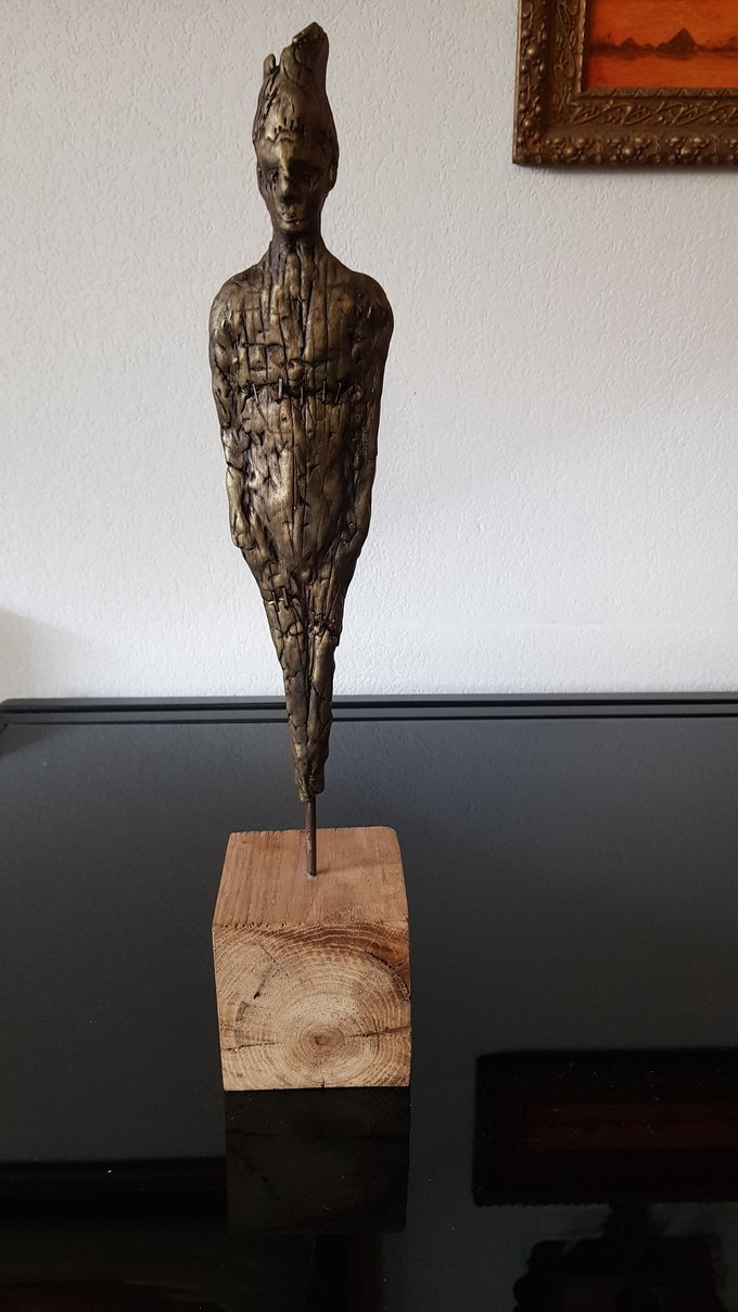 Le socle, ce cube de bois clair fendu de cercles, donne racine. C’est l’histoire du vivant sciée nette. On y voit les années, les douleurs, les saisons. Le bronze, lui, pousse de là, comme une tige ou une colonne. Il semble vouloir rejoindre ce qui nous dépasse. Ces figures sont des arbres inversés, des totems amaigris, des témoins. L’homme s’y retire, mais le geste reste.