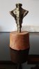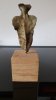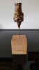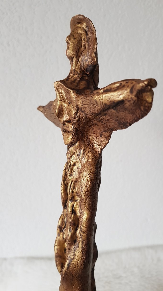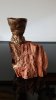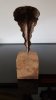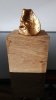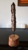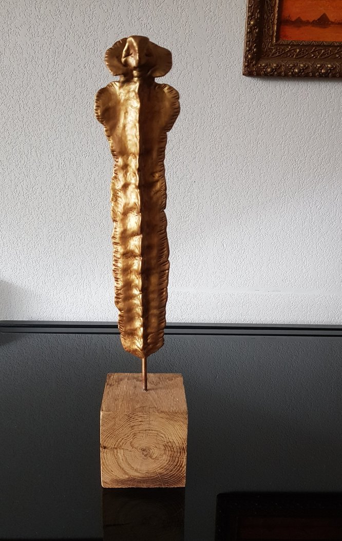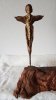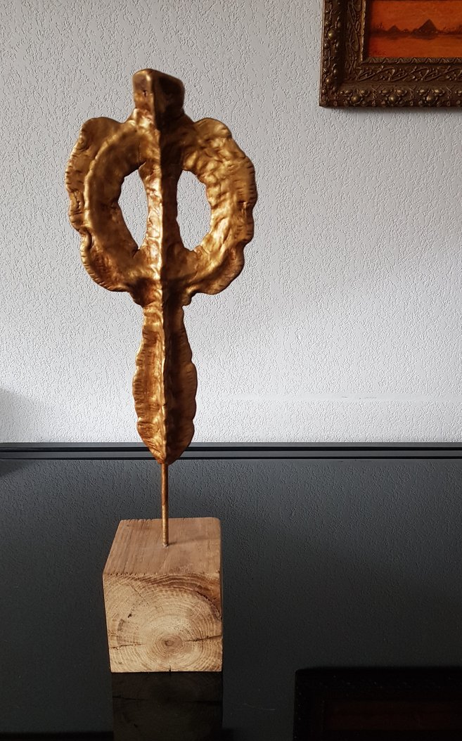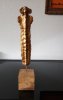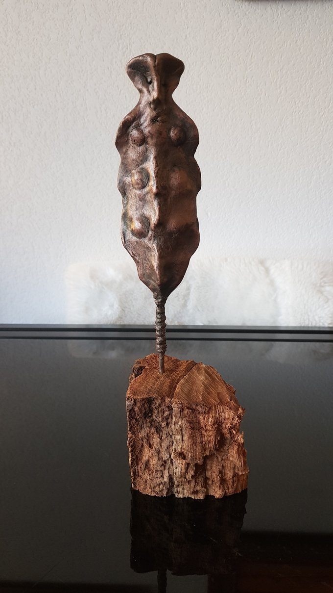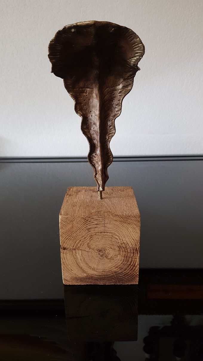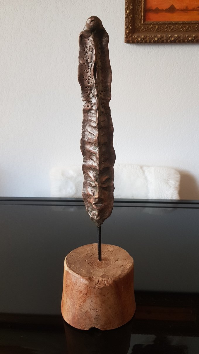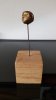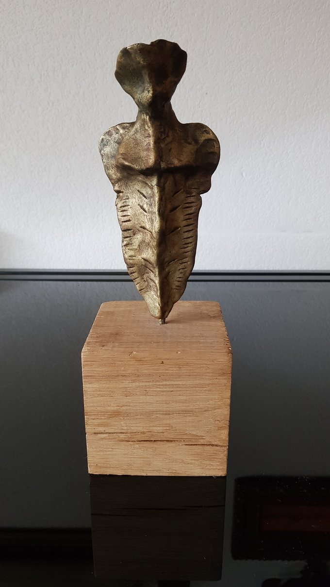 Le socle, ce cube de bois clair fendu de cercles, donne racine. C’est l’histoire du vivant sciée nette. On y voit les années, les douleurs, les saisons. Le bronze, lui, pousse de là, comme une tige ou une colonne. Il semble vouloir rejoindre ce qui nous dépasse. Ces figures sont des arbres inversés, des totems amaigris, des témoins. L’homme s’y retire, mais le geste reste.