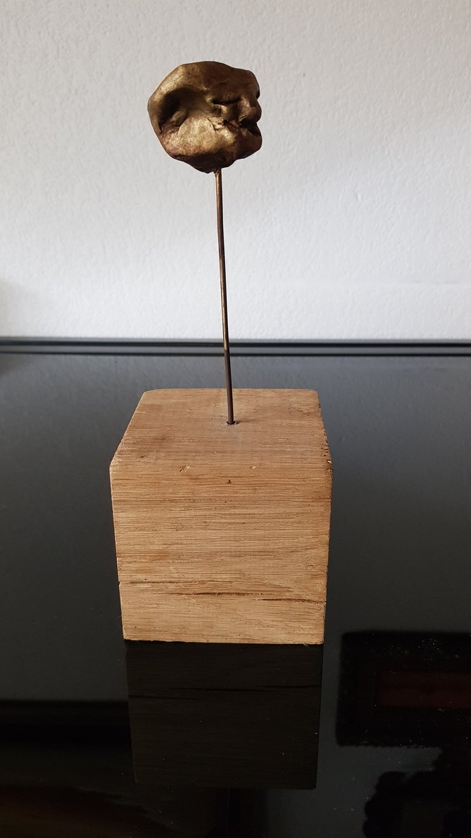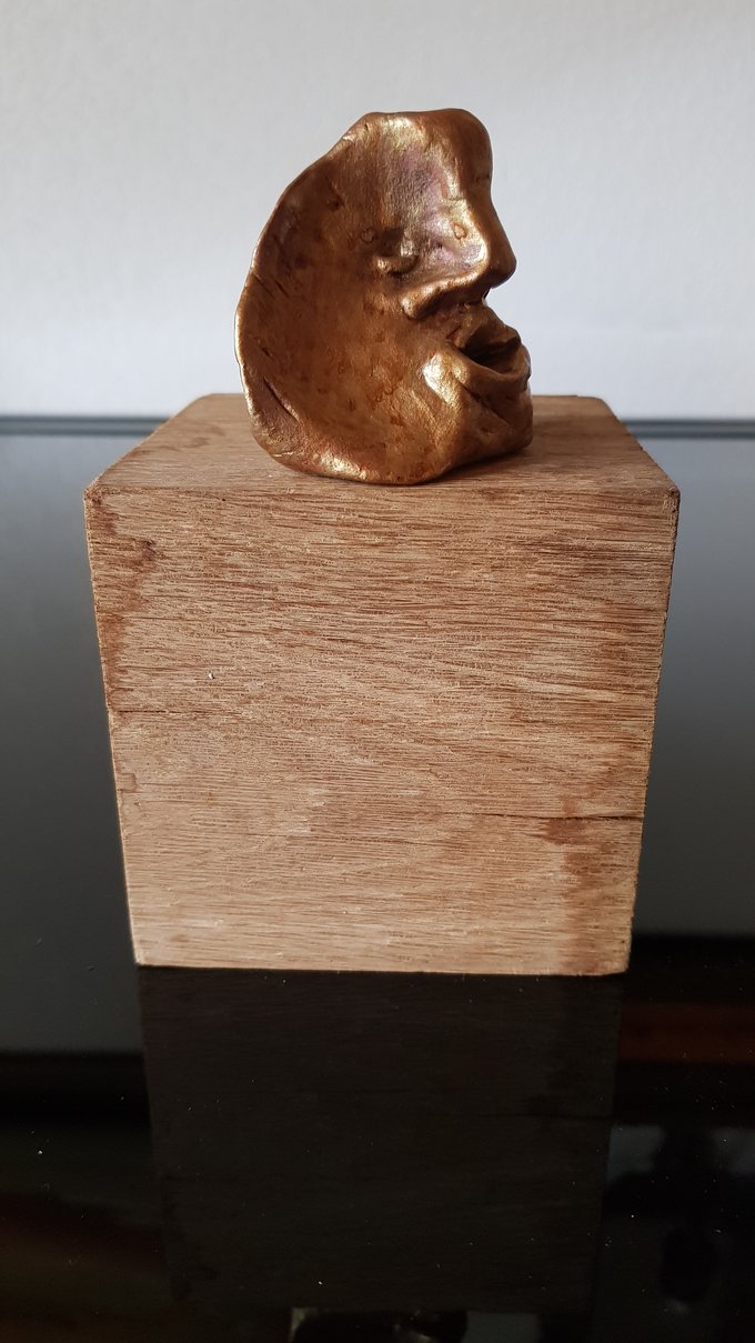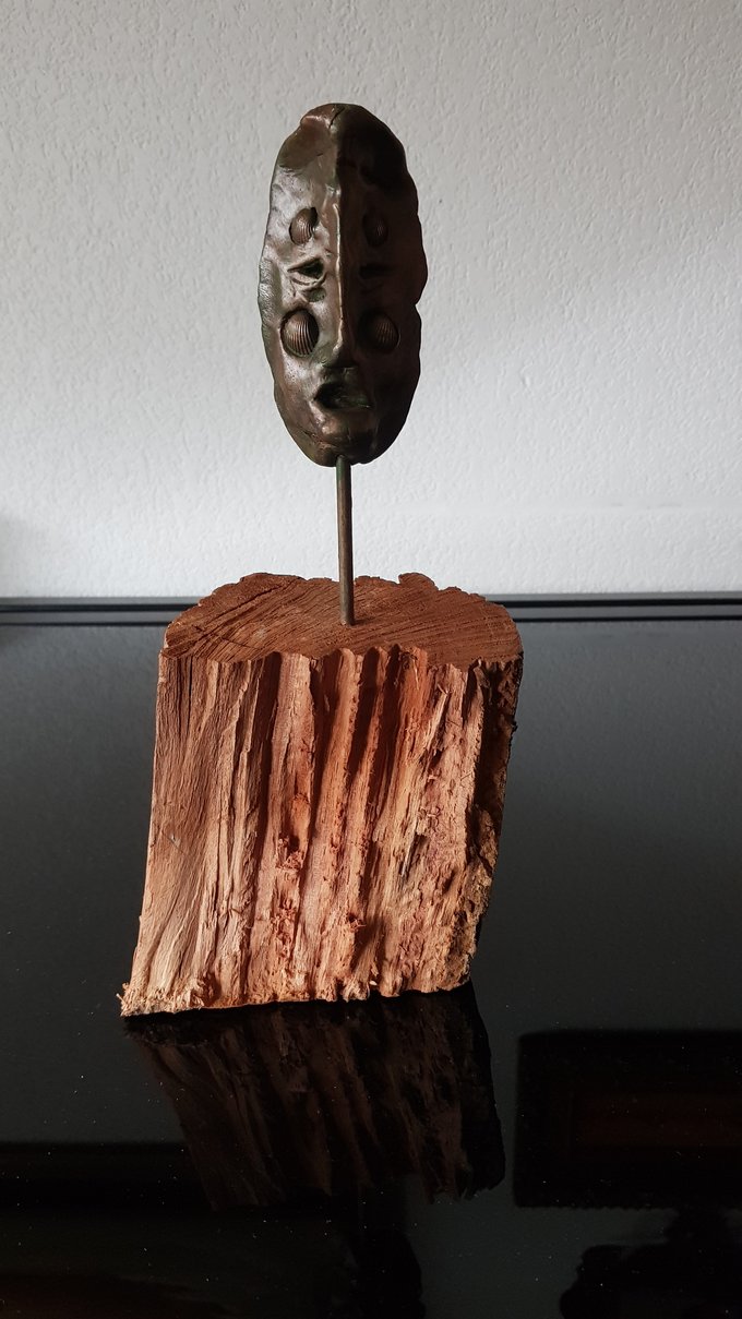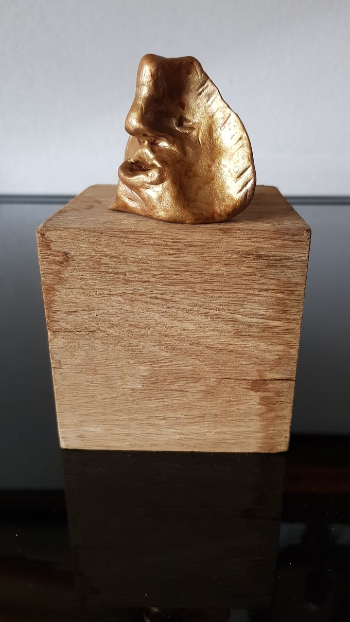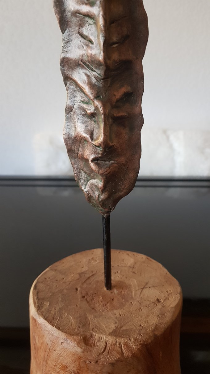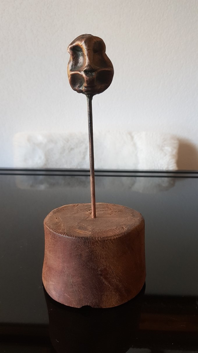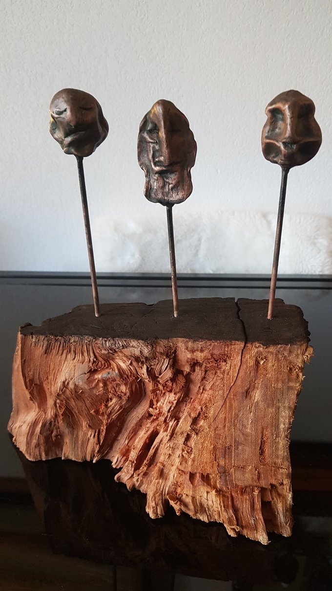 Ces visages sont plus que des portraits. Ils sont les vestiges d’un peuple enfoui – ou en devenir. Ce n’est pas la mort qu’ils disent, mais le passage. Ils nous regardent sans yeux, ils murmurent sans bouche. Ils dorment debout, sur un socle rond comme une offrande ou une racine retournée. Parfois, un visage double se déplie, Janus, gardien des temps, et l’on comprend : ce n’est pas un simple gisant. C’est un seuil.