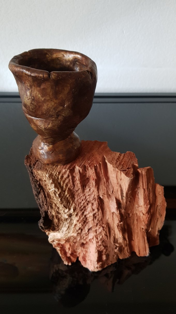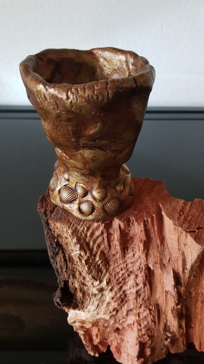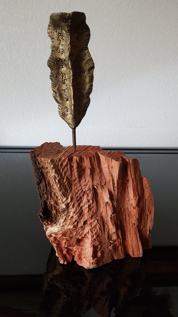 La base, tronc fendu, saignée d’écorce, est comme un socle vivant — le vestige d’un arbre qui aurait survécu à sa propre verticalité. C’est d’elle que tout part : elle saigne d’un bois rouge, d’un feu souterrain. Elle est matrice. Elle est la terre. Elle est ce qui a brûlé, ce qui brûle encore.