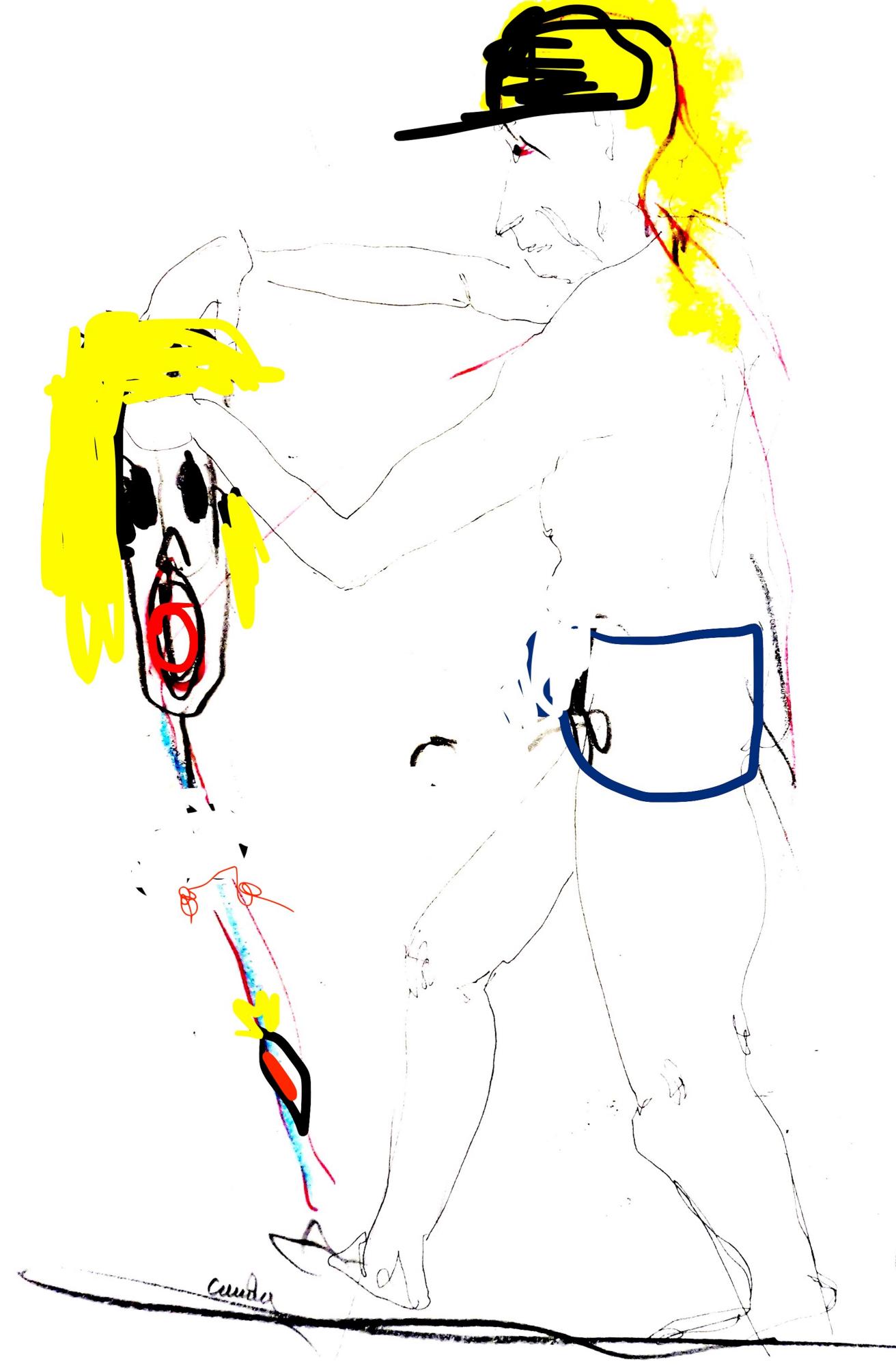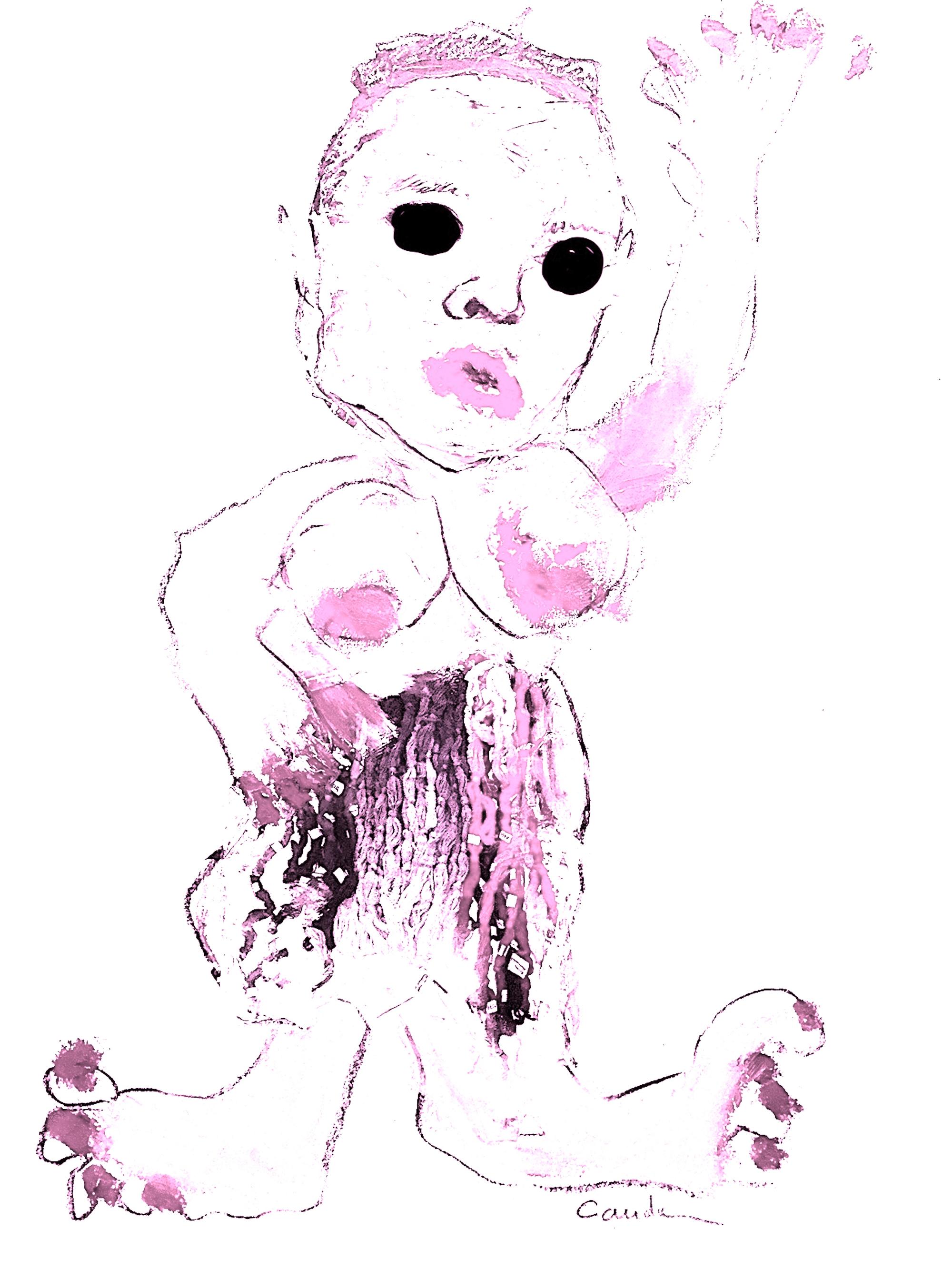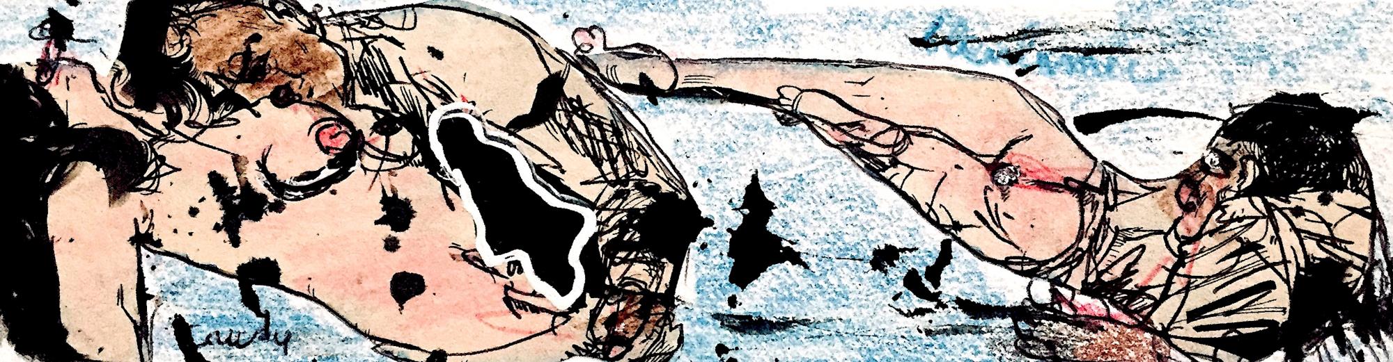 Jacques Cauda manie le noir comme d’autres les éclats : à coups brefs, brutaux, sans fioritures. Il trace, lacère, caresse, tout dans un même élan. Ici, il joue du contraste : le blanc du papier hurle autant que les ombres étalées, et le visage, gratté, laissé à nu, porte la lumière en négatif.