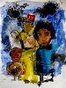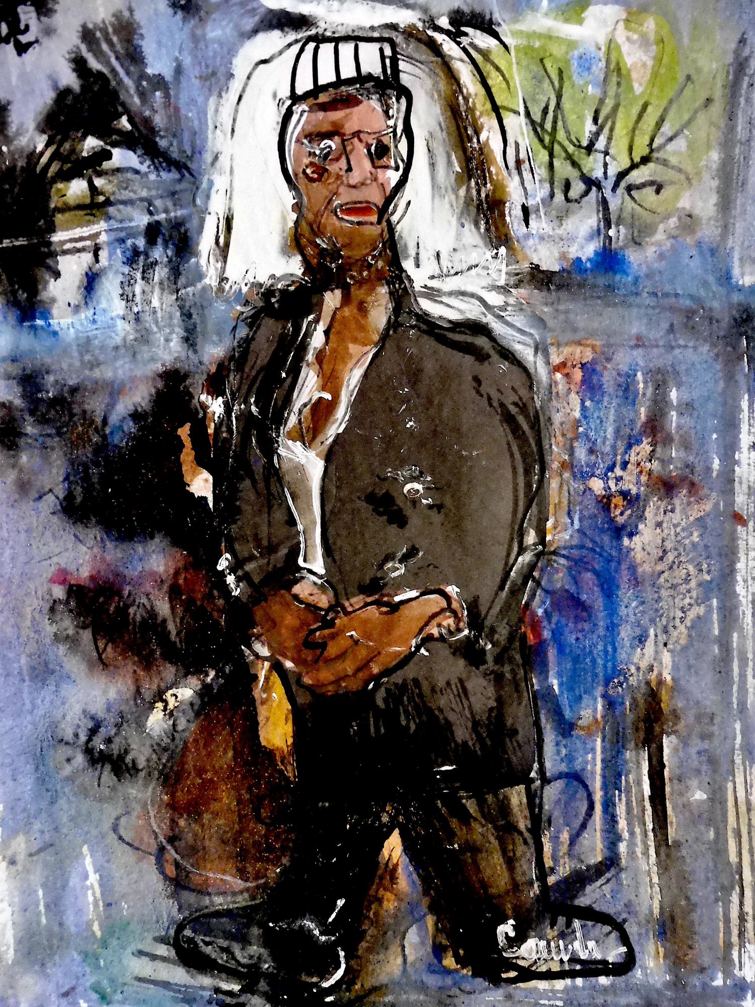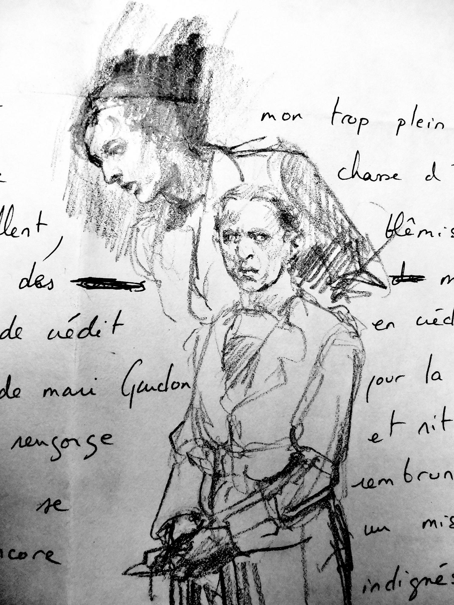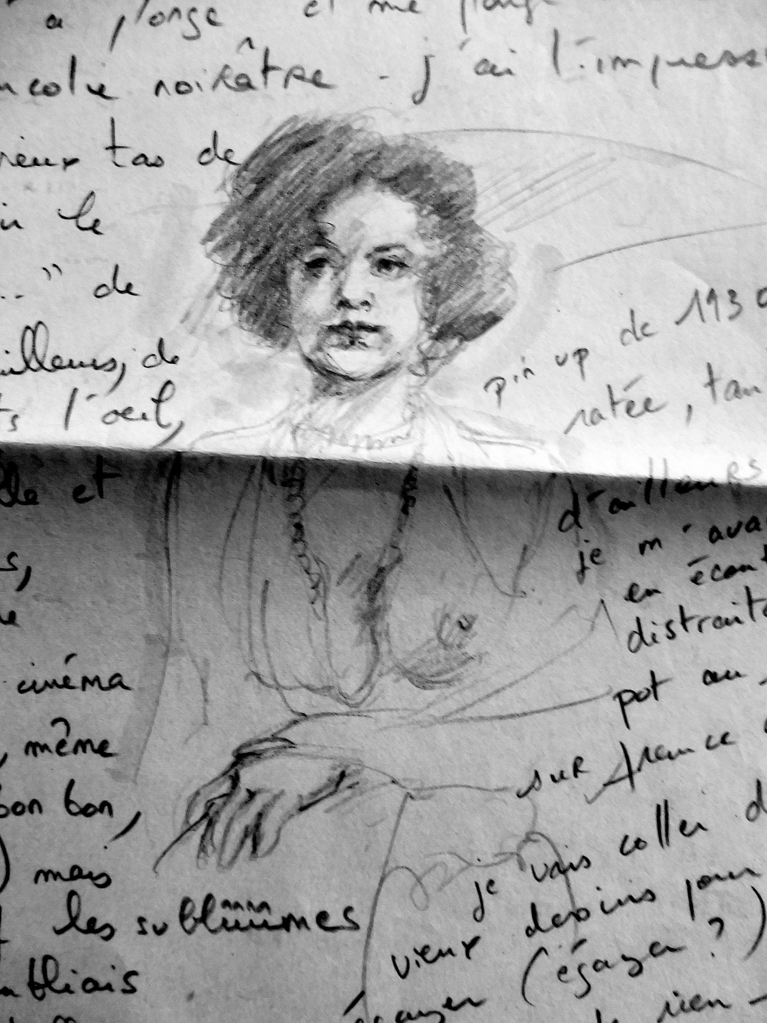 Nous avançons, à petits pas, dans l’encre. La femme penche la tête, mais c’est le monde entier qui chavire. Dans la rudesse des traits, dans l’ébauche plus que le fini, la figure surgit, ambiguë, entre aristocratie et menace. Elle nous scrute, et l’on ne sait : sourire ou défi ? La plume noire à son cou, molle et vivante, est-elle de théâtre ou de rapace ?