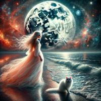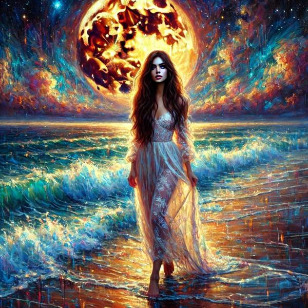 Le sable, glacé par l’éclat lunaire, embrasse tes pieds nus, mais tu avances comme si le monde s’effaçait sous tes pas. Tes longs cheveux, prisonniers d’une lumière rousse, s’épanouissent en mèches vivantes, comme des algues captives des courants d’un océan céleste.