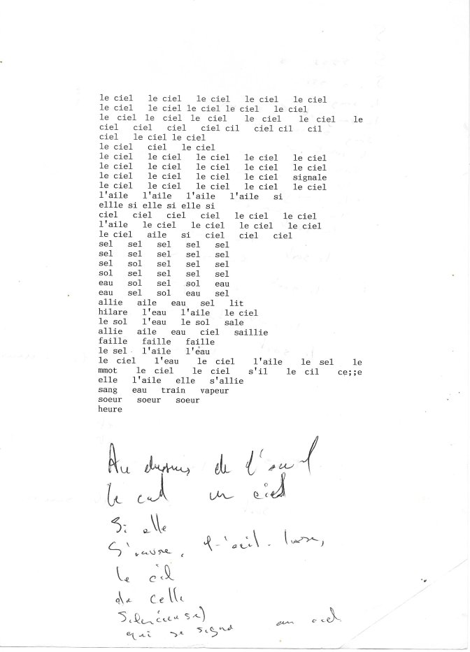 J’aimais bien surtout l’écrasement du bouton "stop" et même celui de "pause" qui était moindre parce que c’était là sa fonction, précisément, au bouton "pause", d’exercer une coupure légère sur la bande magnétique, à l’enregistrement. C’est un enregistrement du train qui a causé la perte du système complet. J’ai continué de promener les étranges combinaisons sonores obtenues par la suite. RIEN - UN TRAIN suivi de RIENLe "panneau" est une situation limite du rien (saturation maximale). Le mouvement de la lecture ne peut plus être linéaire parce que le blanc de la page est remplacé par les lignes de "rien". Pourtant il y a bien au coeur de ces textes des lignes - irais-je jusqu’à dire des vers ? Mais il faut les chercher, en sorte qu’effectivement, le "mouvement" de la lecture est pour ainsi dire paralysé, on est pris jusqu’au cou dans une "boue" de rien. La dimension visuelle est renforcée, c’est vrai, mais pas exclusive je crois. La dynamique de "rien" finalement existe dans le cheminement des différents développements, de l’écriture linéaire de rien aux tableaux de n n n n n n n jusqu’aux grands murs de rien rien rien rien rien rien rien rien rien rien rien rien rien rien et puis à tous les accidents de "rien" que sont la cuisson des pates en lettres, la plaine, le train, etc.